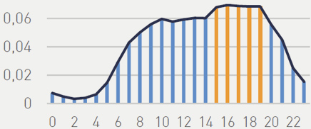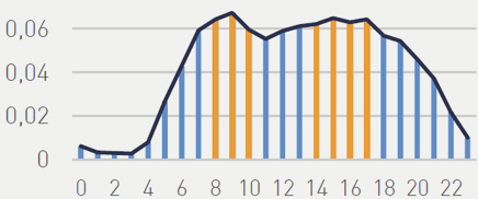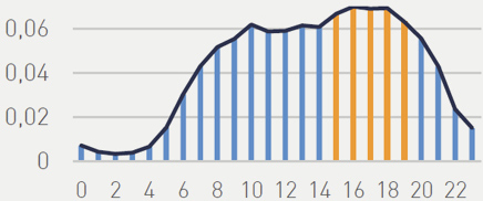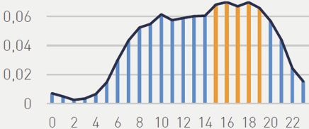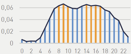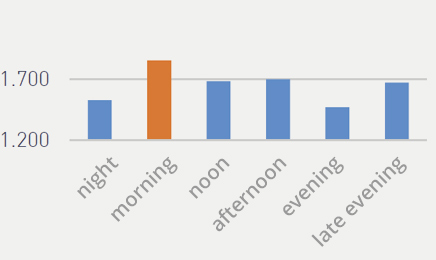 Maximum difference between 8 am and 8 pm is 2.3% (concentration) Two notable peaks are around 9 am and 4 pm.